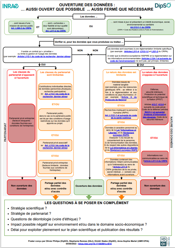 Le scientifique doit choisir le degré et les modalités d’ouverture/fermeture de ses données. Il est nécessaire de prendre en compte l'aspect juridique des données sensibles, des données personnelles et notamment le règlement général sur la protection des données (le RGPD), ainsi que la protection