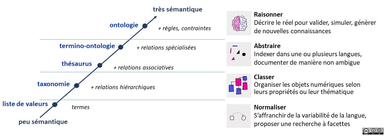 Les vocabulaires sont aussi appelés ressources sémantiques ou artefacts sémantiques. La typologie des vocabulaires s’apparente plus à un continuum qu’à des catégories clairement définies. Voici quelques clés pour s’y retrouver.
