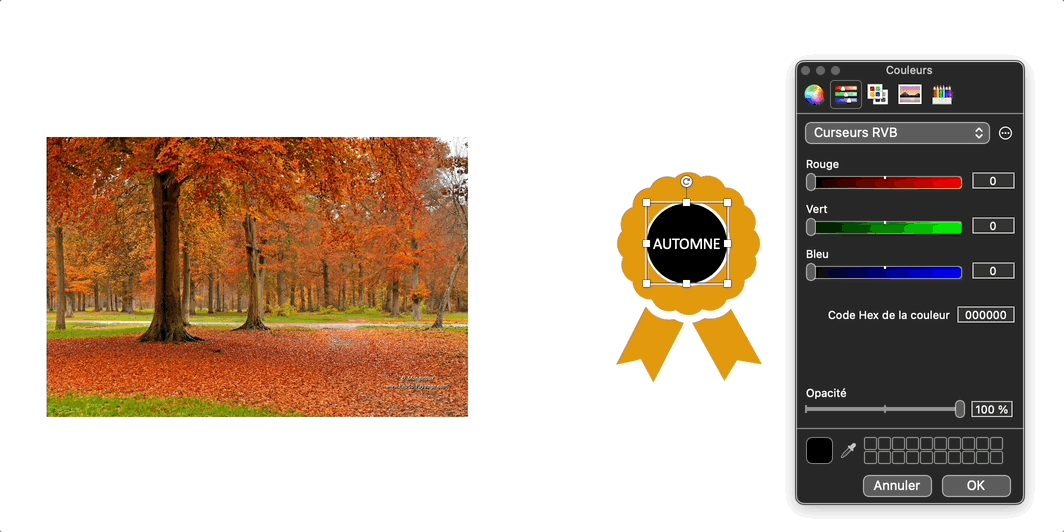 • Chercher une image contenant une palette de couleurs adaptée à votre badge, et utiliser l'outil pipette de votre logiciel pour récupérer les codes couleur