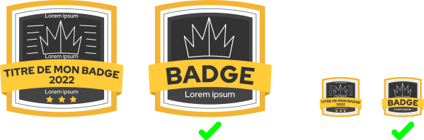 Un badge est une image aux dimensions réduites, il y a peu de place disponible pour les contenus. En général, ce qui va primer le plus ce sont les illustrations (icônes, étoiles, forme du badge, ruban et autres éléments décoratifs), ce qui fait que la partie textuelle est renvoyée à son strict minimum.