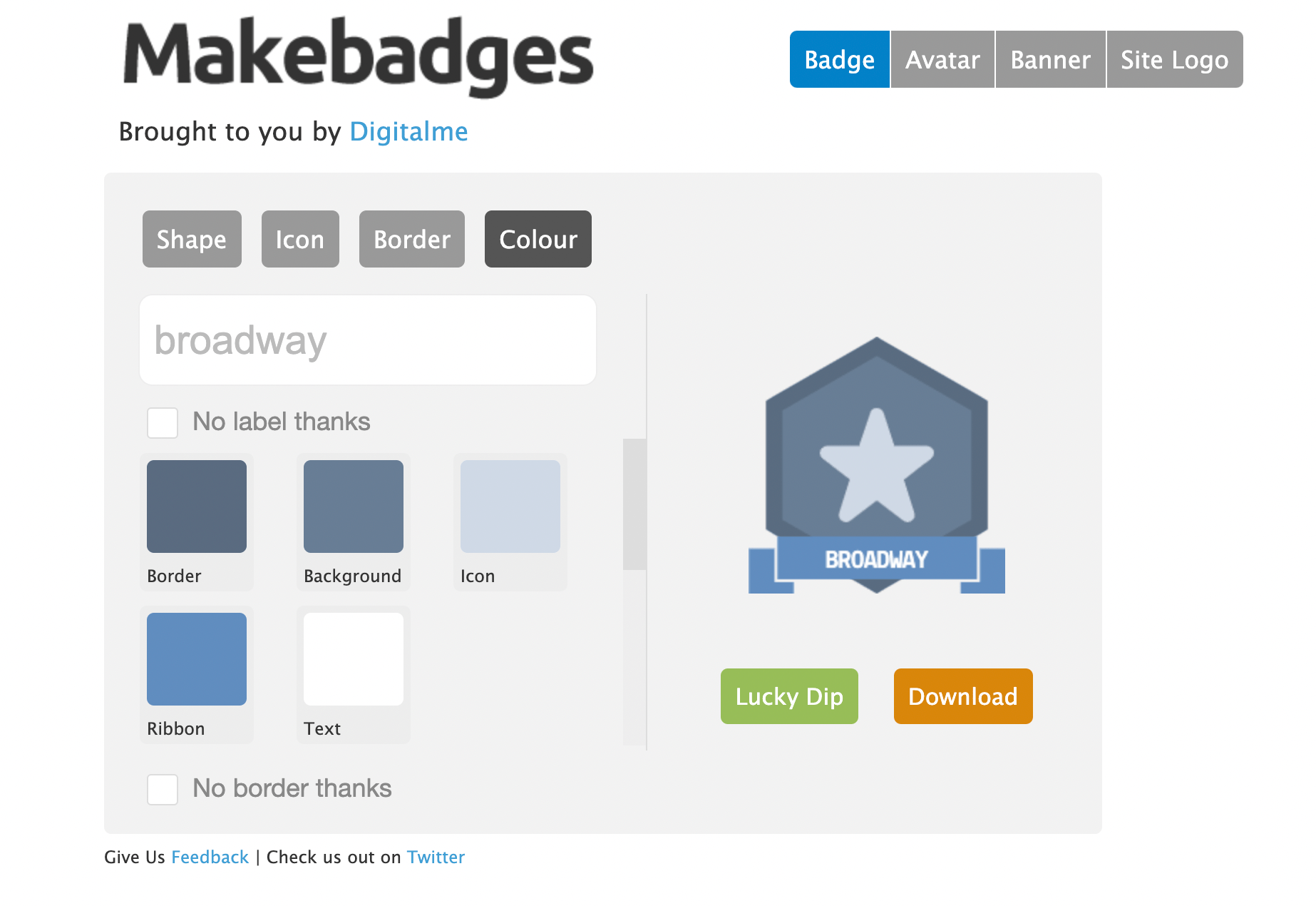 Vous pouvez choisir une forme de base, personnaliser les icônes, les bordures, les couleurs, le texte et exporter le tout au format PNG. Il y a aussi un générateur aléatoire ("Lucky Dip") pour changer les éléments au hasard.