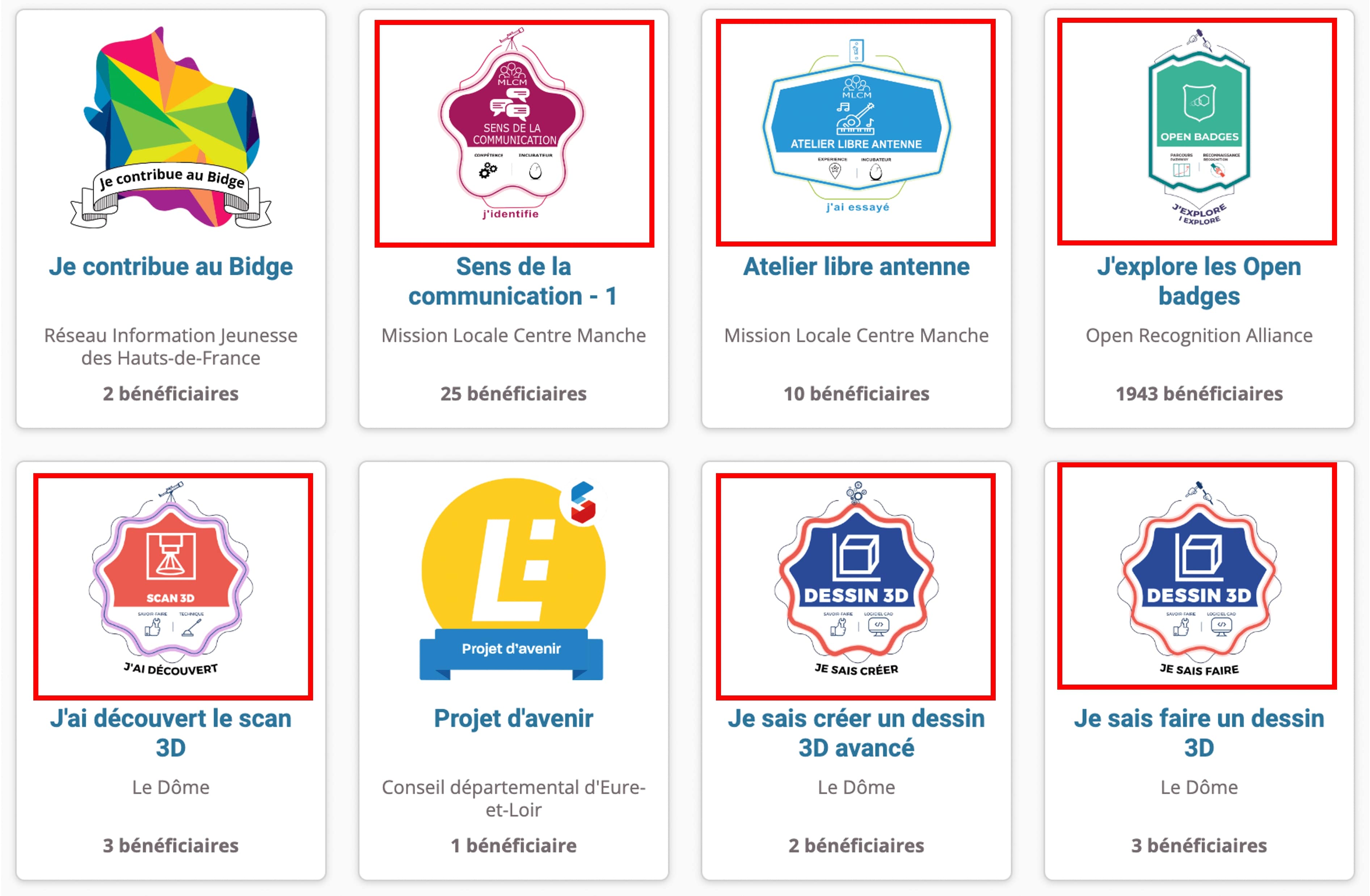 Dans la galerie d'Open Badge Passport par exemple, on voit fréquemment ressortir les visuels issus du générateur d'Openbadge, ci-dessous encadrés en rouge.
