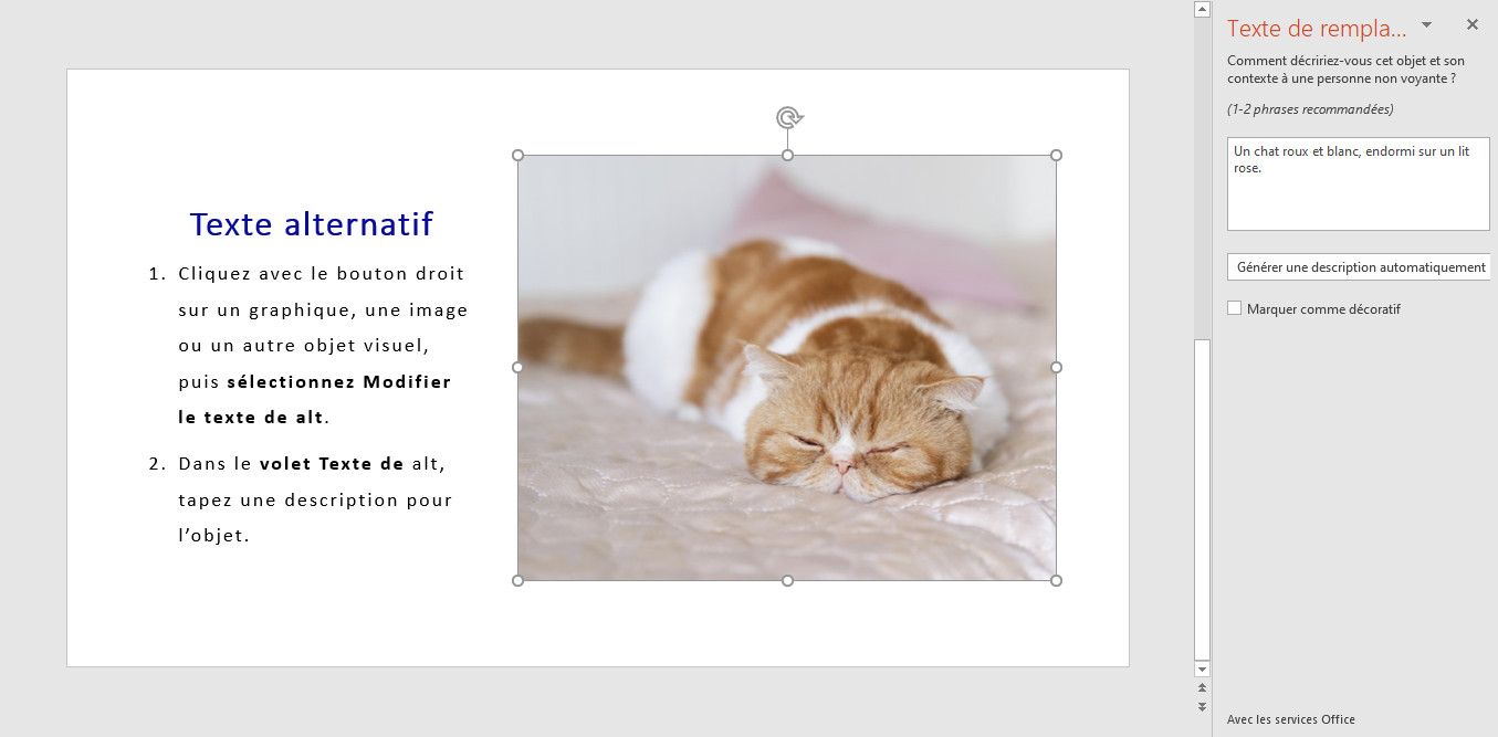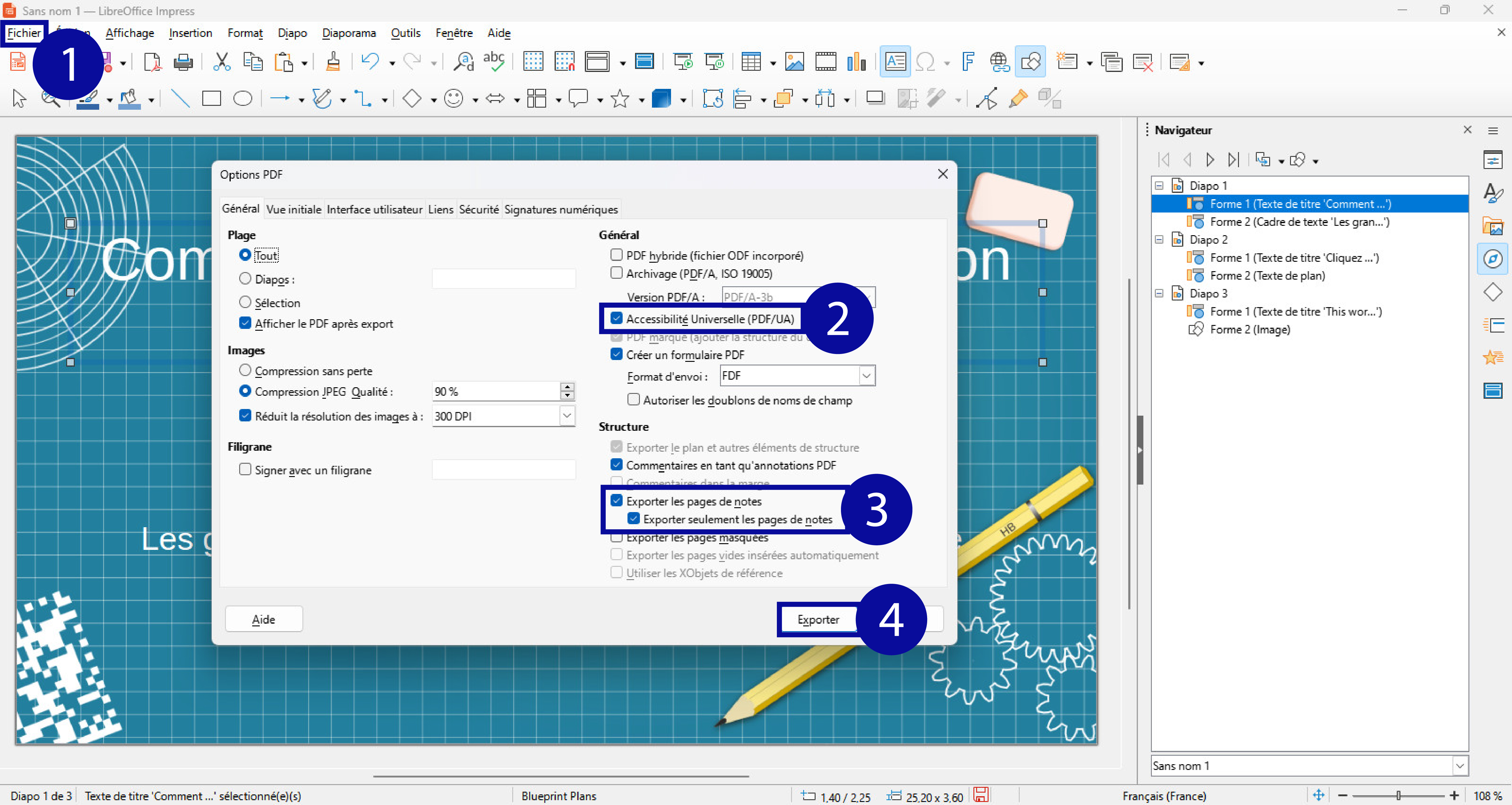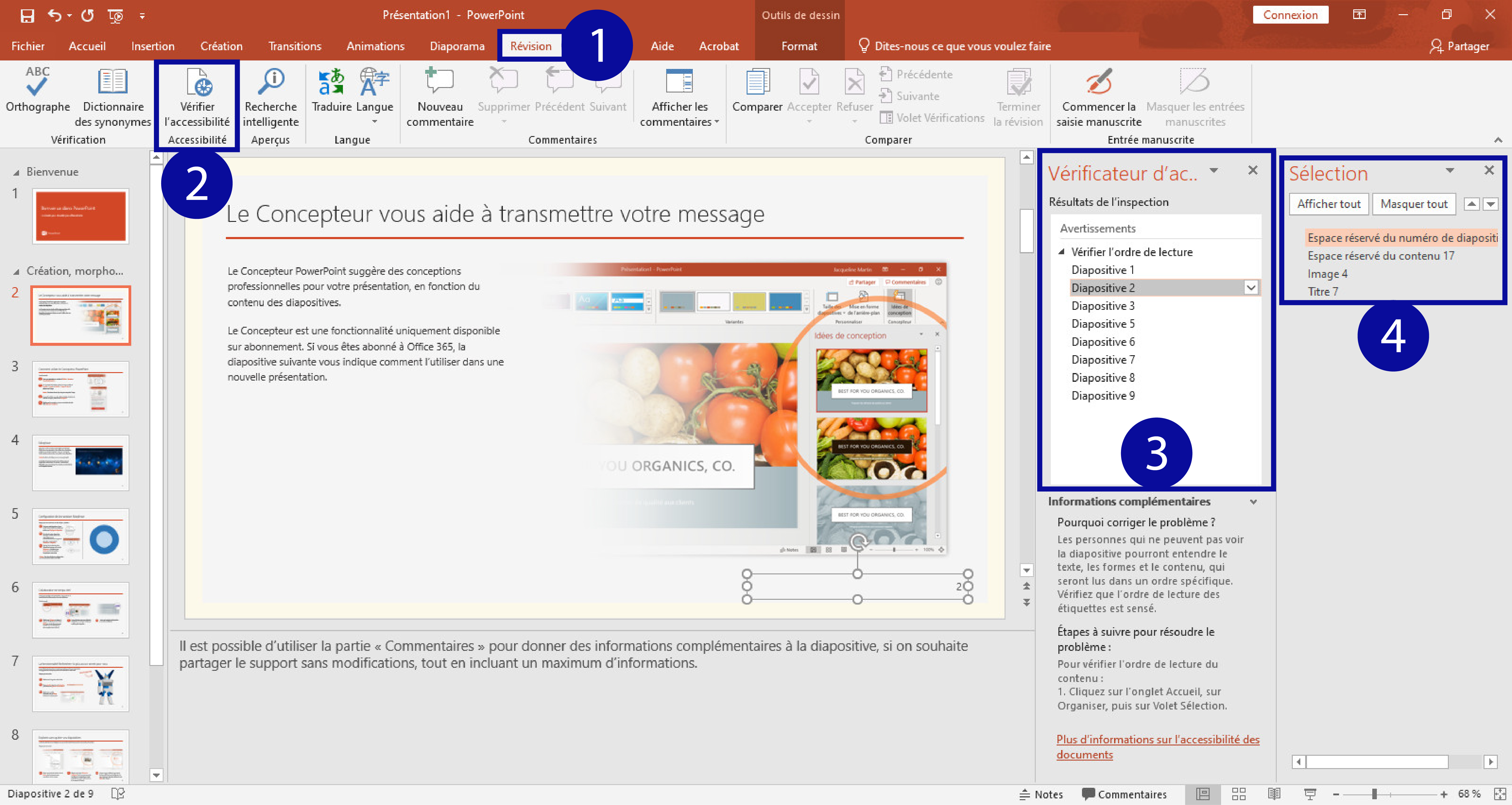Dans cette partie nous verrons l'étape à réaliser avant la finalisation de votre diaporama, afin de vous assurer que celui-ci est bien conforme aux règles d'accessibilité.