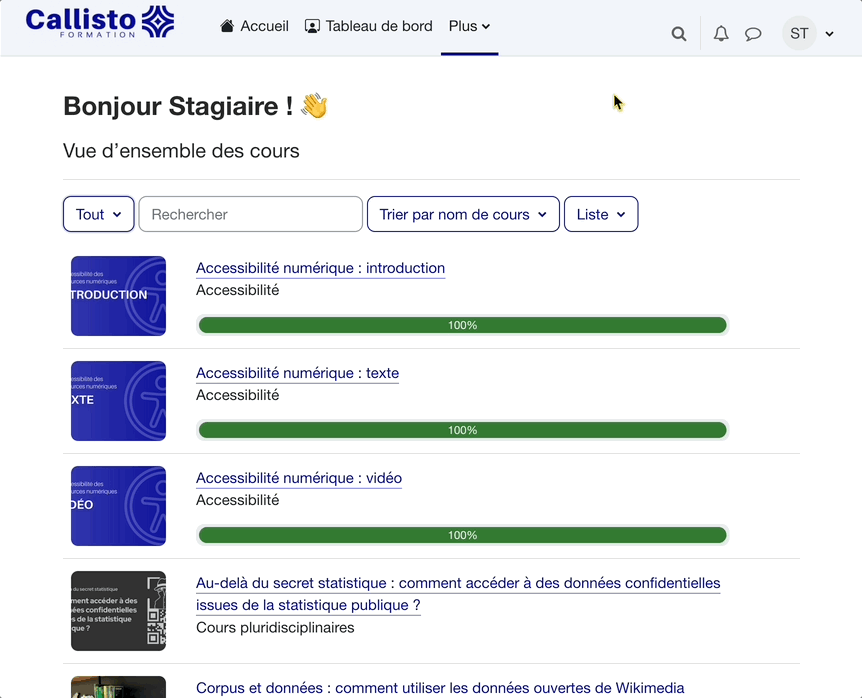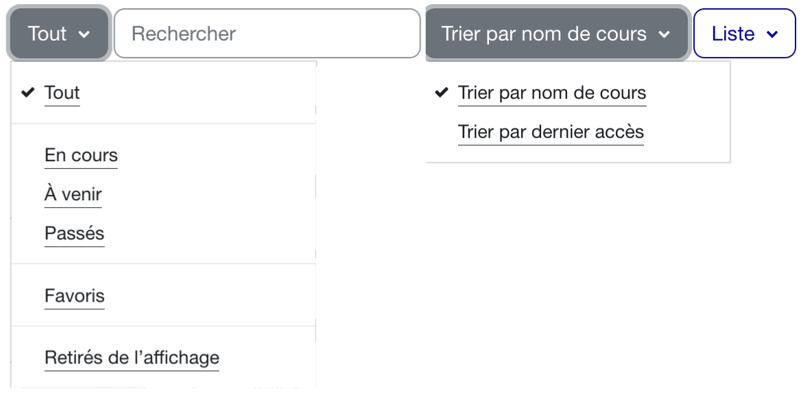 Une fois connecté, l'onglet Mes cours vous donne une vue d'ensemble des cours dans lesquels vous êtes inscrit. Un système de filtre vous permet d'organiser leur affichage, ce qui se révèle très utile lorsque la liste des cours est longue.