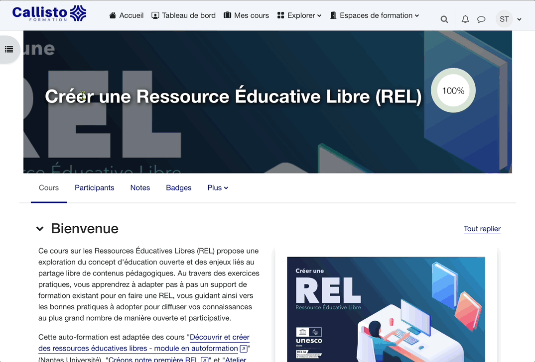 Callisto propose des formations liées aux domaines des bibliothèques, de la documentation, de la science ouverte et de l'éducation ouverte. Les cours peuvent être accessibles en libre accès, sur inscription ou sur auto-inscription. Vous pouvez les trouver depuis le menu principal.
