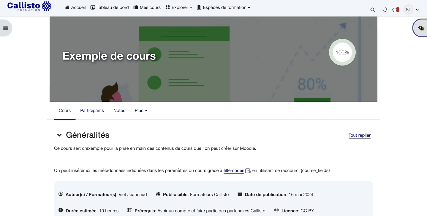 Un exemple concret : ce texte ici présent contient un bouton "Marquer comme terminé". Après avoir cliqué dessus, cet élément sera considéré comme achevé et pris en compte dans votre progression de cours. Ici, votre progression a été rendue disponible dans le tiroir des blocs (vous pouvez vérifier).