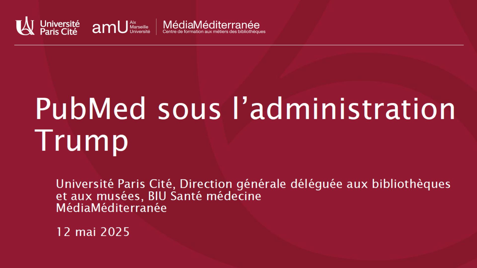 Dans ce contexte, de nombreuses craintes sont apparues sur l'avenir de PubMed, moteur de recherche utilisé dans le monde entier, et sur les bases de données Medline et Eric, qui dépendent directement de l'administration états-unienne. Ce webinaire vous propose de faire le point sur les risques qui pèsent sur ces outils et de réfléchir ensemble aux alternatives possibles.