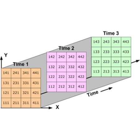 Un tableau tri-dimensionnel est un tableau en 2D qui évolue selon un troisième facteur de dimension (par exemple ci-dessous le temps).
