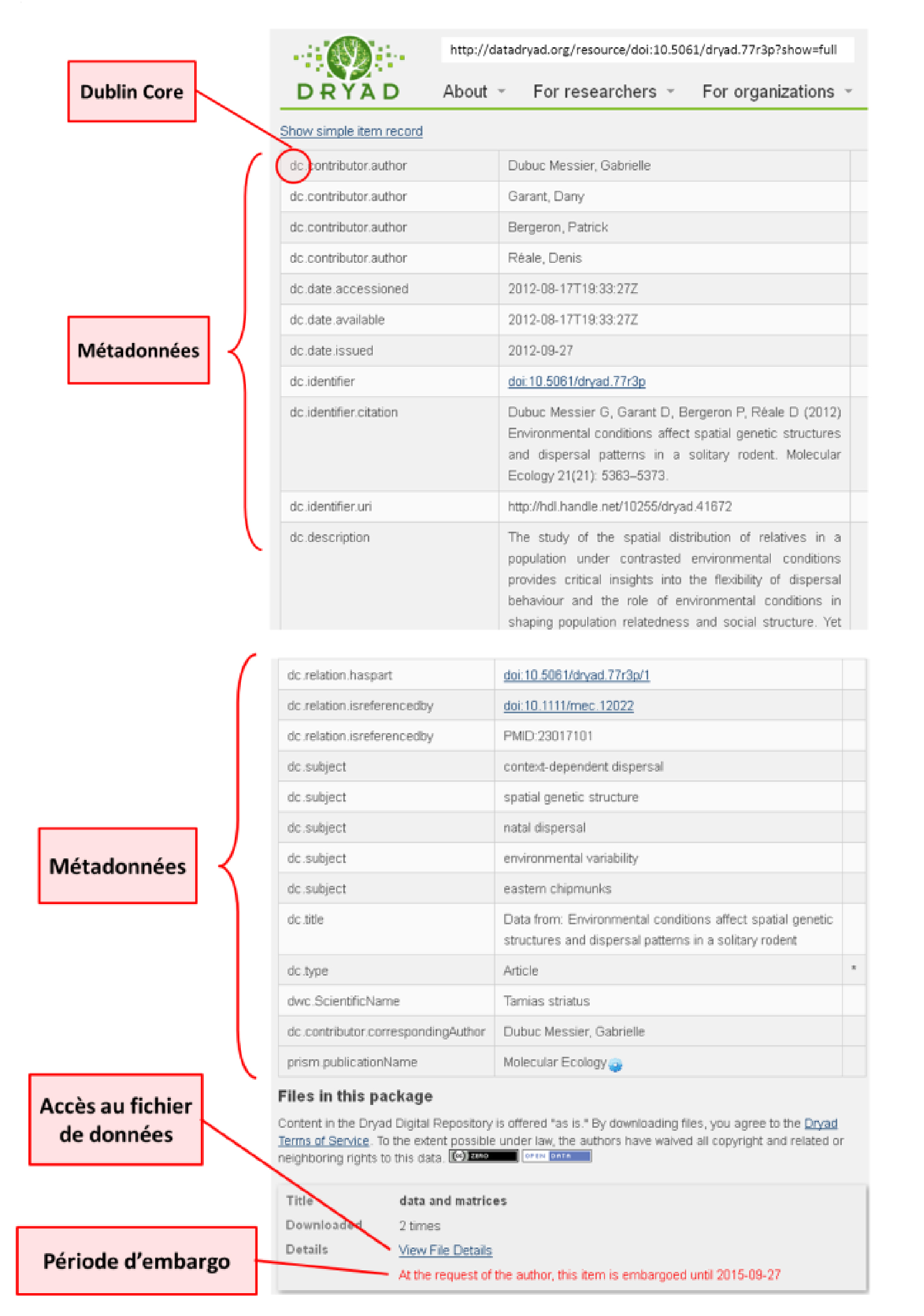"Le Dublin Core, également connu sous le nom de Dublin Core Metadata Element Set (DCMES), est un ensemble de quinze éléments de métadonnées principales pour décrire les ressources numériques ou physiques. C’était la première norme de métadonnées pour décrire le contenu Web.[...] Les ressources décrites à l’aide du Dublin Core peuvent être des ressources numériques (vidéo, images, pages Web, etc.) ainsi que des ressources physiques telles que des livres ou des œuvres d’art. Les métadonnées Dublin Core peuvent être utilisées à des fins multiples, de la simple description des ressources à la combinaison de vocabulaires de métadonnées de différentes normes de métadonnées, en passant par l’interopérabilité des vocabulaires de métadonnées dans le nuage de données liées et les implémentations du Web sémantique."